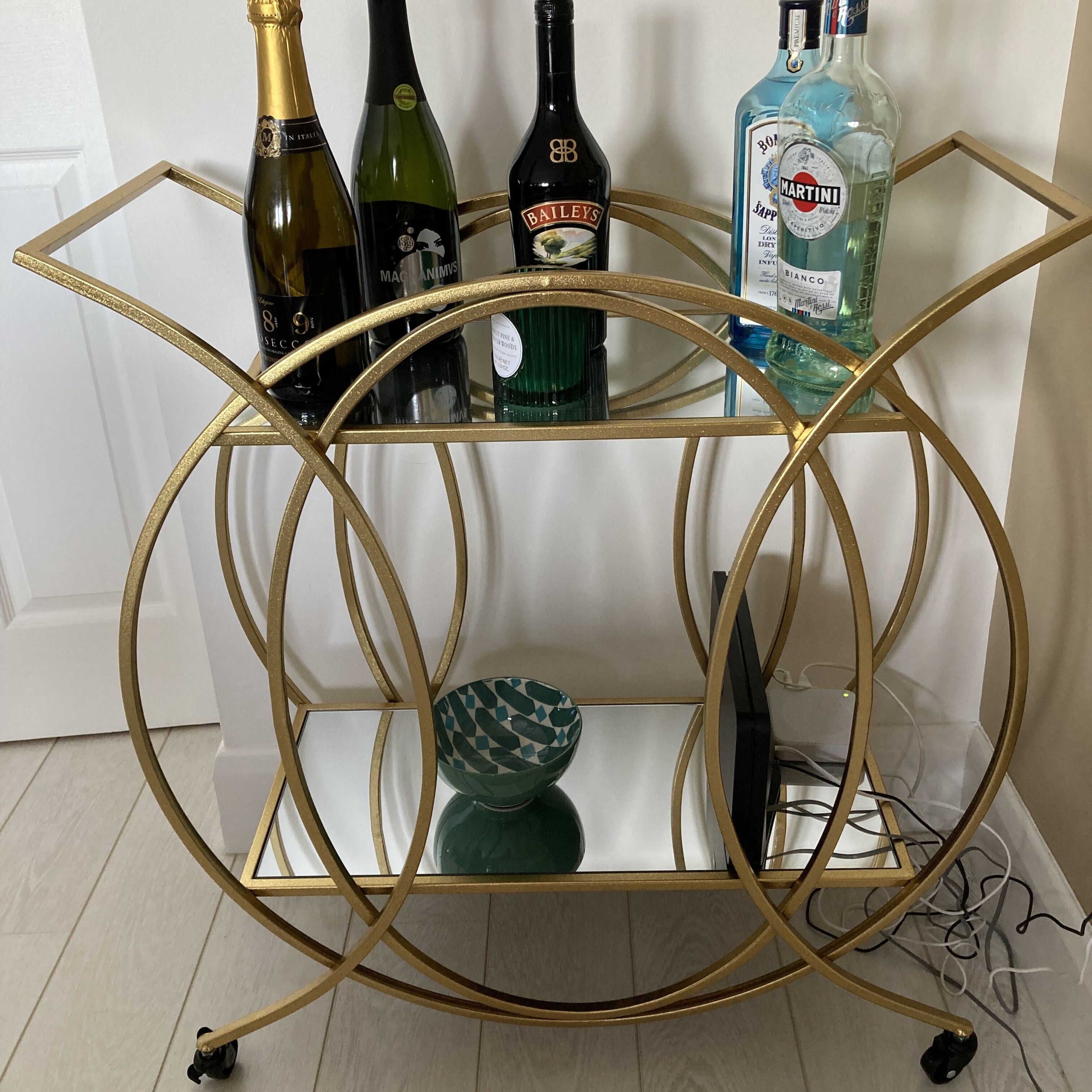 The Gold Drinks Trolley combines timeless elegance with practical sophistication. Featuring two mirrored glass shelves, it provides ample space for displaying your favourite glassware and spirits, while the sleek iron frame in a luxurious gold finish adds a touch of glamour. Designed with smooth-rolling black wheels, it moves effortlessly from room to room, making it perfect for entertaining or as a stylish accent piece. With its refined silhouette and eye-catching design, this trolley brings a sense of modern opulence to any living or dining space.