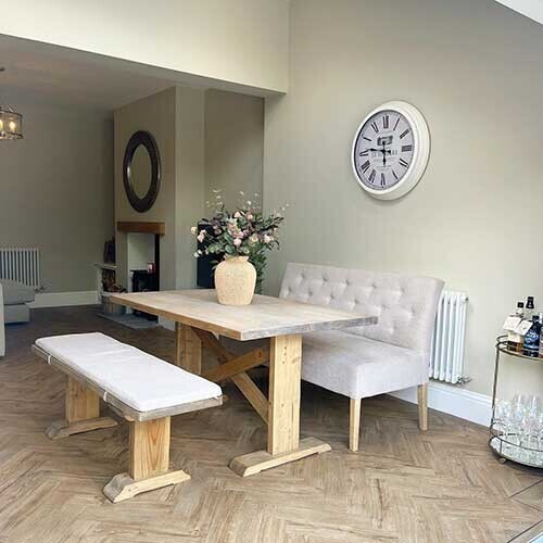 Add a touch of relaxed style to any dining space with the Medina Upholstered Bench, featuring buttoned back detailing and solid wood grey waxed legs. Designed to fit with our Newsham dining range, the Medina offers comfort and support, perfect for family dinners. Available in other fabrics and colors you are bound to find your ideal combination.