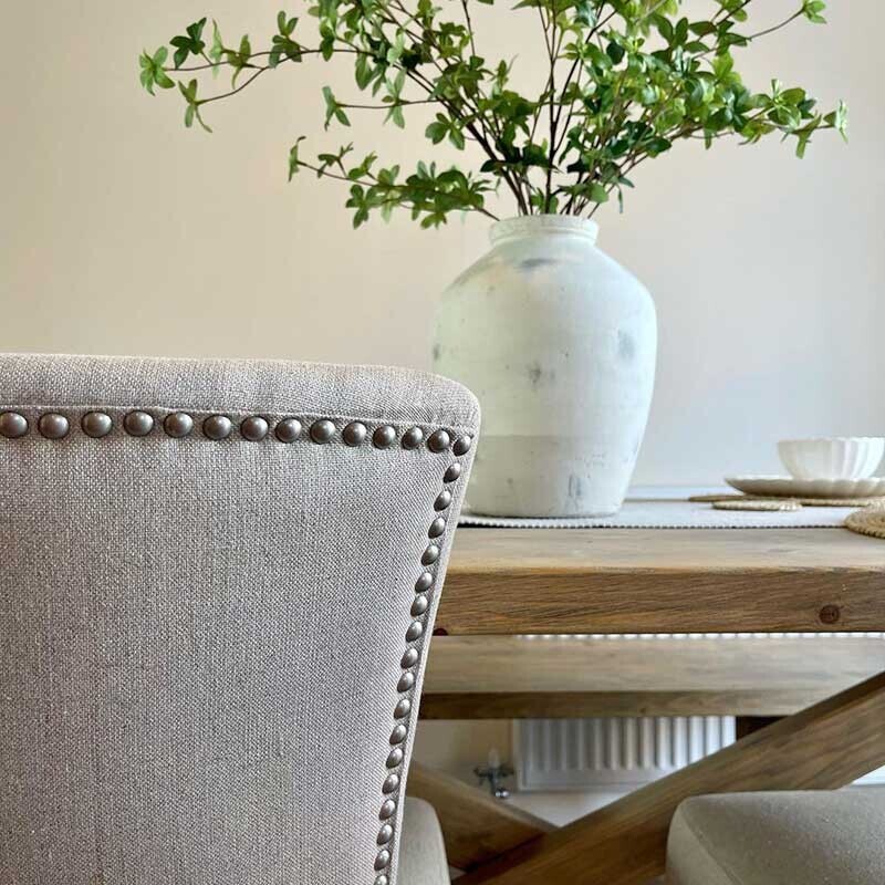 Elevate your dining area with the Otto dining chair—featuring an ash wood frame, white linen fabric, and exquisite stud detailing to the back. Its blend of foam and polyfibre seat cushioning ensures optimal support and plush comfort for a delightful seating experience. The added stud detailing on the back enhances its charm, making it a stunning addition to your dining space.