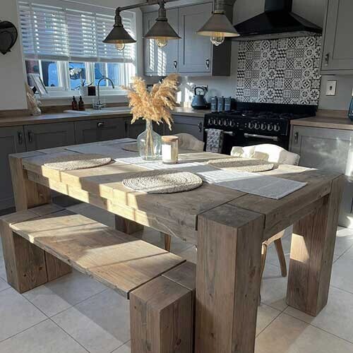 The Samson Reclaimed Wood Bench suits country and rustic styles. Beautifully crafted with reclaimed and old conifer timber, the chunky and reliable frame certainly makes a statement. The Samson Reclaimed Wood Bench pairs perfectly with our Samson Dining Table. Try adding faux fur or knitted throws for a cosy, warm touch.