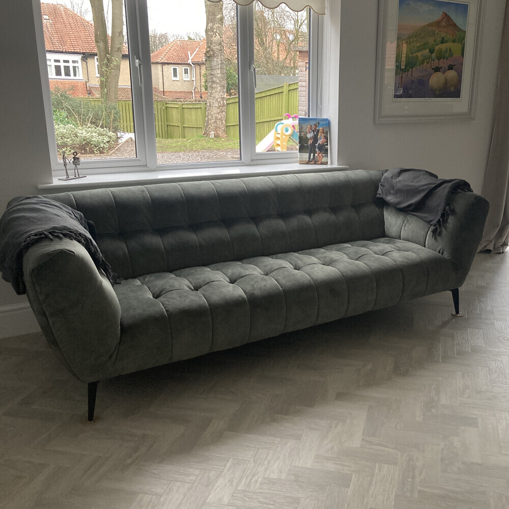Wrapped in rich dark green velvet, this sofa instantly elevates your space with its contemporary elegance. Its inviting shape and plush, buttonless tufting make it the perfect spot for movie nights, and gathering with loved ones all while adding a bold, luxurious touch to your room.
