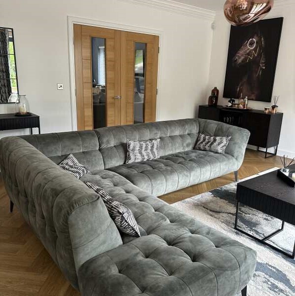 A durable blend of engineered wood and solid hardwood forms the foundation of this sturdy corner sofa, while sleek black iron legs add a refined modern finish. From its resilient structure to its soft velvet upholstery, it’s a long-lasting centrepiece crafted for real-life lounging in style.