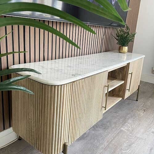 Fuji Fluted Mango Wood 2 Door TV Unit with White Marble Top , Mango Wood And White Marble And Antique Brass
