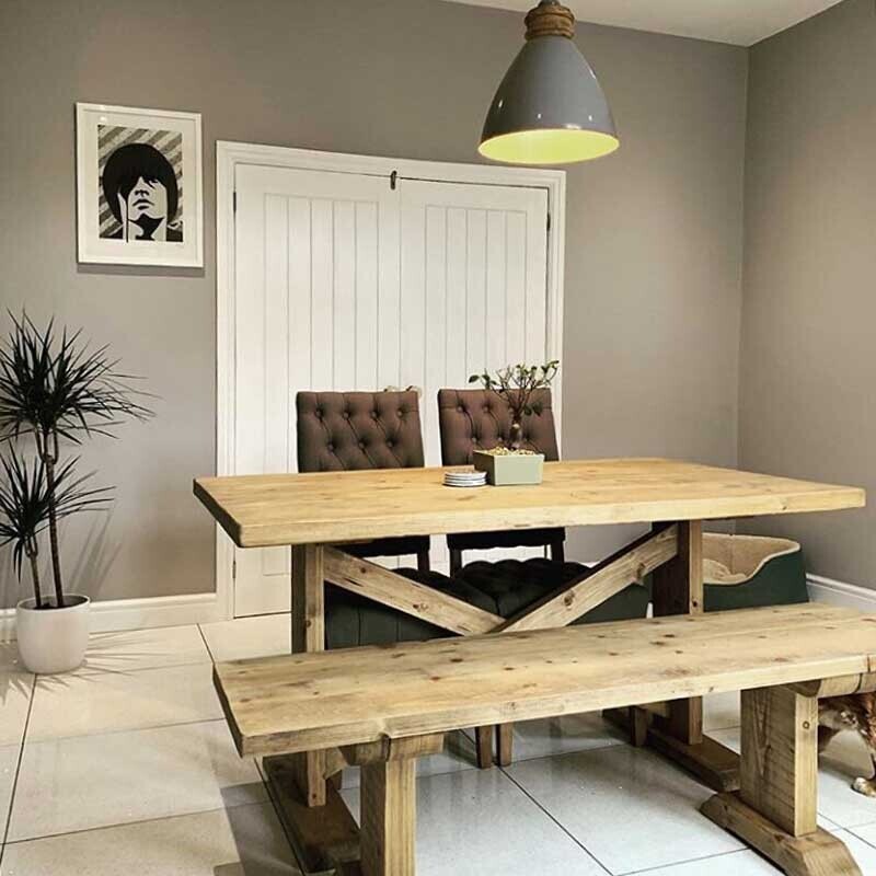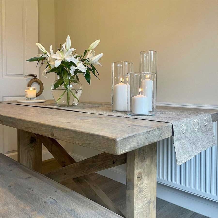 Crafted from reclaimed timbers the Newsham dining table has a rustic and solid feel, beautifully finished with a grey wax creating a smooth surface and enhancing all the knots and grain details of the wood creating a unique piece. The design features a cross brace support adding to the rustic look and feel.