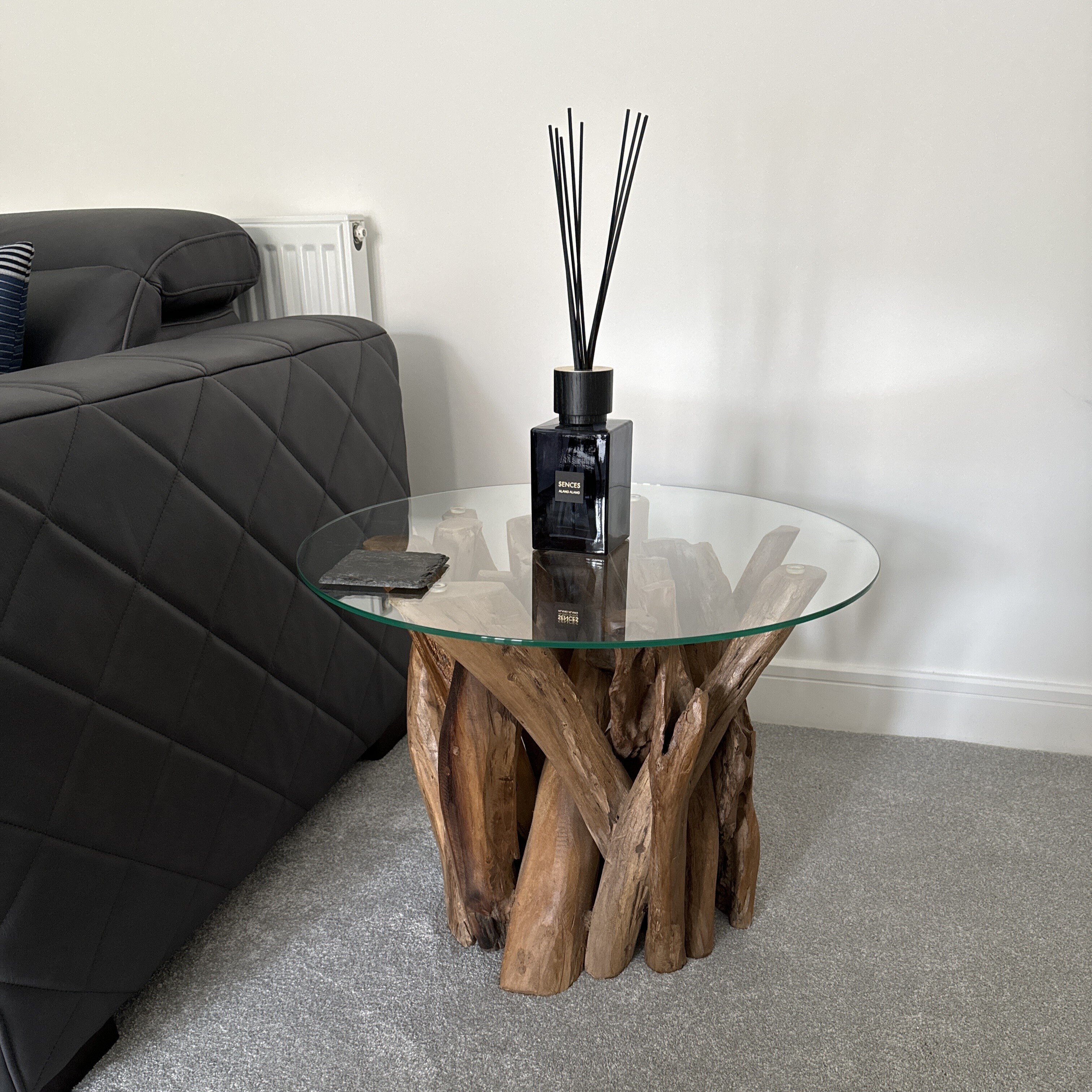 The Whinfell Round Lamp Table is the perfect way to present nature into your home with its unique reclaimed teak roots as the base of the table. The glass top is both durable and solid to place a table lamp and drink upon whilst relaxing. A distinctive piece that is a real conversation starter and would look perfect in a variety of interior decor styles.